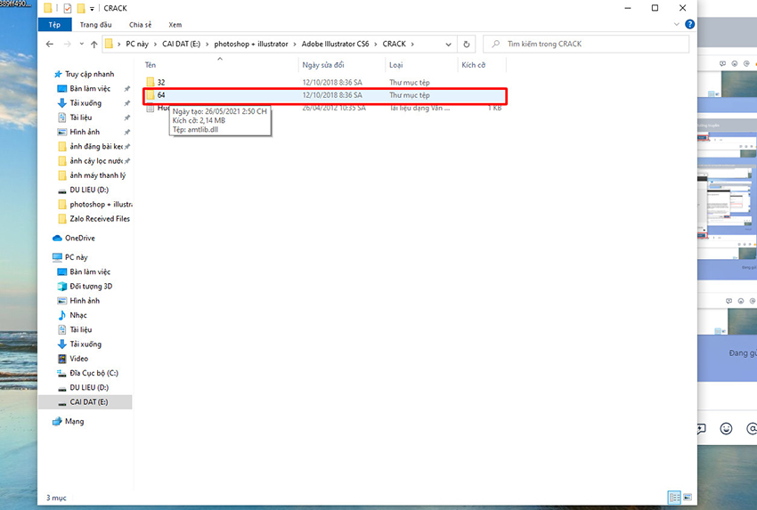 Vào thư mục CRACK/64 copy file Amtlib.dll paste vào ổ C:\Program Files\ Adobe \ Adobe IIIustrator CS6(64Bit) \ Support Files \ Contents \ Windows.