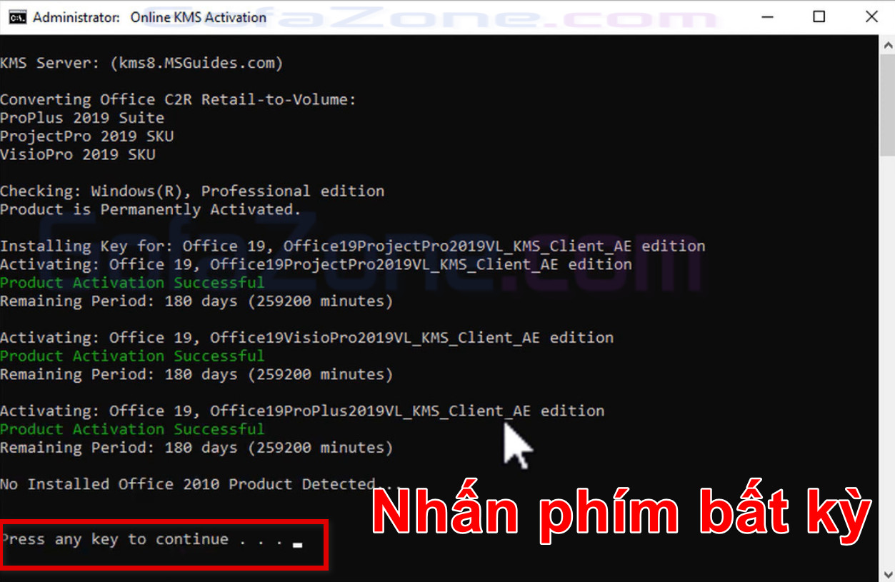 Chờ phần mềm kích hoạt xong thì nhấn phím bất kỳ để thoát. Bạn có thể xóa file kích hoạt đi sau khi hoàn tất.